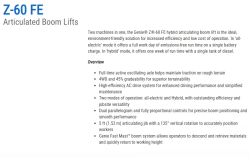 This piece of industrial equipment is in top-notch condition, promising durability and reliability for years to come. It has been meticulously maintained, with regular oil changes, routine maintenance, and thorough inspections. The 230-hour runtime reflects a machine that has been lightly used, and the hybrid diesel and electric power systems are in excellent operating condition. The 4WD functionality has been tested and proven to perform efficiently on various terrains, and the high platform and working height features are fully operational. All safety features and controls are in perfect working order, ensuring a safe and efficient working environment.